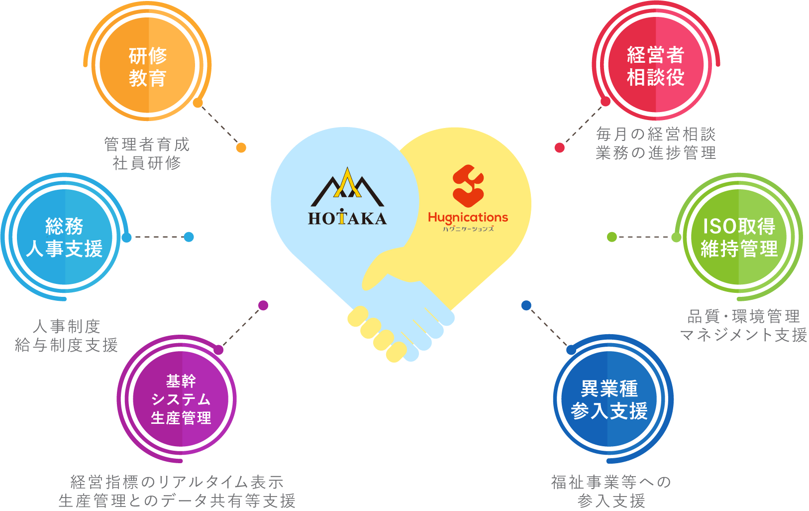 HOTAKAは企業支援の分野において、株式会社ハグニケーションズと提携しております。 ハグニケーションズのミッションは「働く人の幸せをつくる」、ビジョンは「働く人が喜びを実感でき る会社をつくる」です。HOTAKAが考える経営改革や業務改善の理念も「人は人でしか磨かれない」という点に焦点を当て支援していくものであり、「人が人を活かす」という言葉をキーワード にしているハグニケーションズの考える世界観や手法とリンクしております。